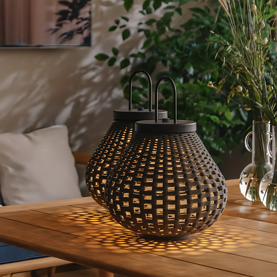 Découvrez la lanterne LOMBRA, conçue pour l’extérieur avec une armature métallique robuste et un abat-jour en tissu brun vintage.